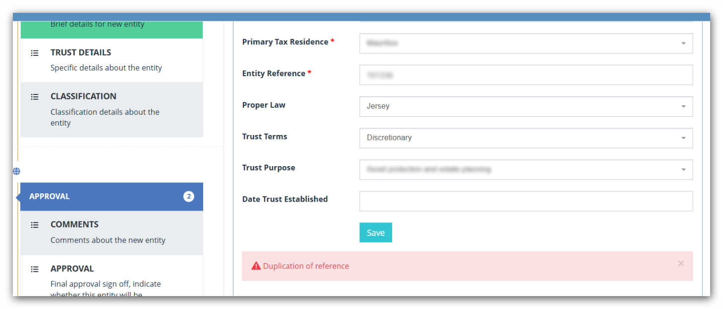 In the event you see a Duplication of reference warning when adding an onboarding record in WealthWorks+, please search WealthWorks+ for other records sharing that Entity Reference.