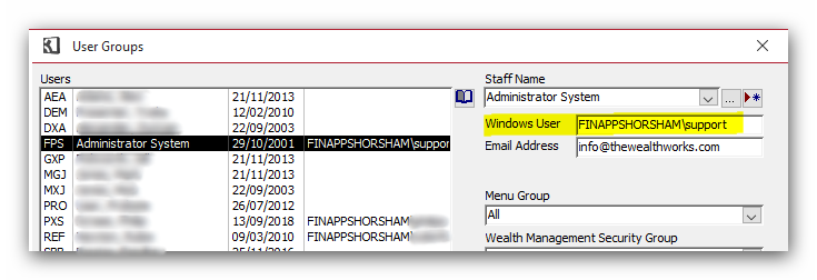 To avoid users signing into the UAT database using existing production single sign-in details, existing Windows Authentication content in user records on the UAT database should be deleted. Access the Utilities module, Security tab and the menu option User Groups - Edit and remove all 'Windows User' content for all users: